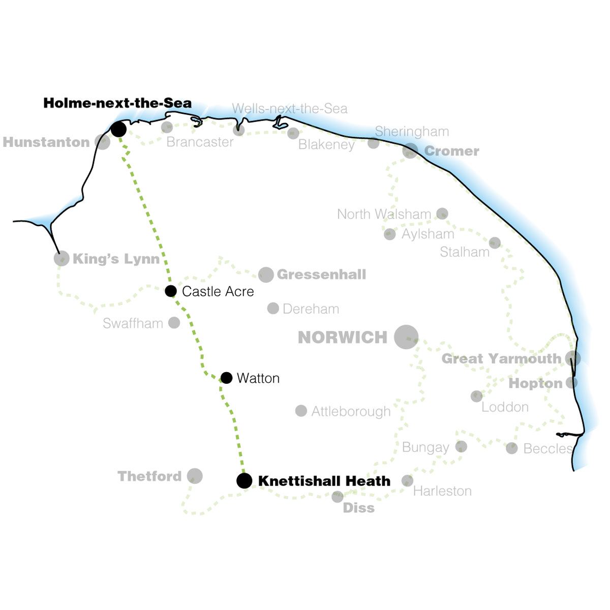 From the wooded, sandy Breckland heaths at Knettishall, the path passes through Castle Acre with its ruined castle and priory, with the path ending at Holme-next-the-Sea.