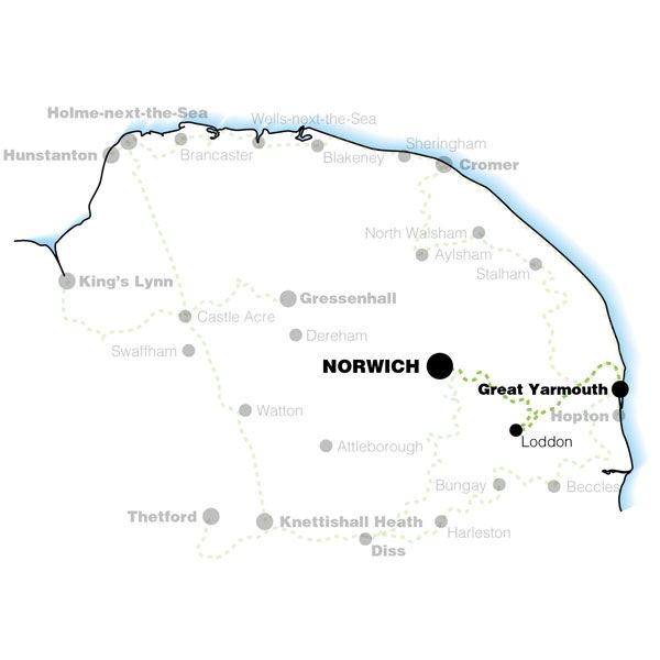 It runs between Norwich Railway Station and Great Yarmouth Railway Station, using footpaths and quiet lanes within the Broads National Park. This route provides a fantastic way to experience the Broads, following the trading route of the historic Norfolk wherries. The wherry, a large cargo-carrying barge whose elegant black sails, was a once common sight on these waters.