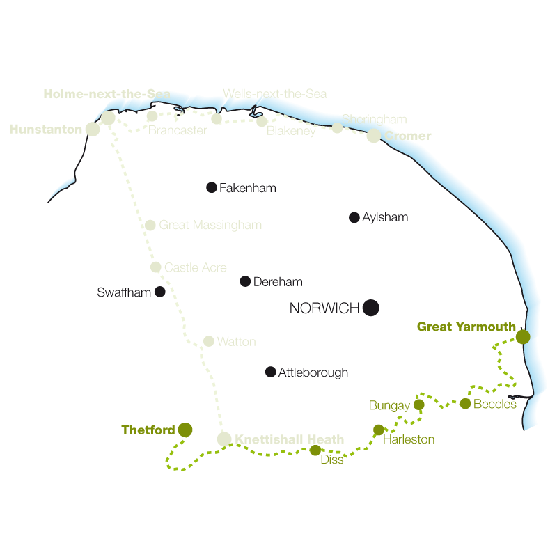 After leaving Great Yarmouth, the route follows the tidal expanse of Breydon Water and along the river Waveney. It passes through the ancient market towns of Beccles, Bungay, Harleston and Diss before finishing in Thetford.